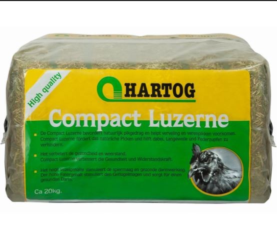 Hartog Compact Luzerne kip bestaat uit 100% derde snede luzerne. De Compact Luzerne is van hoge kwaliteit en is zeer populair ruwvoer in de moderne pluimveehouderij.