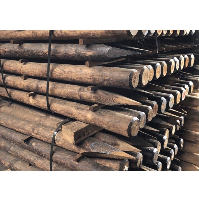 Vuren palen, 250cm kop rond 10cm, gecreosoteerd, gepunt en gekruind.