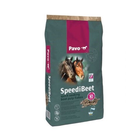 Pavo SpeediBeet is een hoogwaardig ruwvoer dat de darmgezondheid ondersteunt. Het is gemaakt van ontsuikerde bietenpulp vlokken en bevat geen enkele toevoeging dus ook geen melasse. De vlokken worden bewerkt via een gepatenteerd verhittingsproces. Hierdoor kan het product snel – 10 minuten – geweekt worden, in warm én koud water. Lekker, handig en gezond voor álle paarden