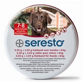 De vlooien- en tekenband van Seresto is een innovatieve, geurloze en waterbestendige halsband die bescherming tegen vlooien en teken bij uw hond (>8kg) biedt.