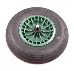 velg van polypropyleen kunststof, kleur groen. geen roestvorming en geen vastroestend lager. met tubeless buitenband 16 x 4″ – 2 ply (400×100 mm). as met binnenschroefdraad aan de uiteinden met rollenlager, stofdoppen tegen het indringen van vuil en 2 wielbouten.